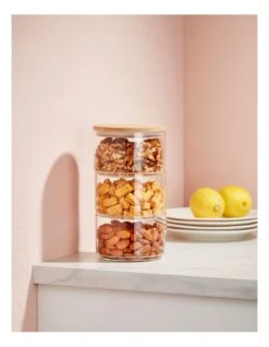 Stylish 3-tier glass jar set with Bamboo lid. Perfect for storing things in the pantry or on the Kitchen bench without taking up much space. Hand wash with warm water only. 11cm Diameter x 7cm high per jar 11cm Diameter x 21cm total height.
